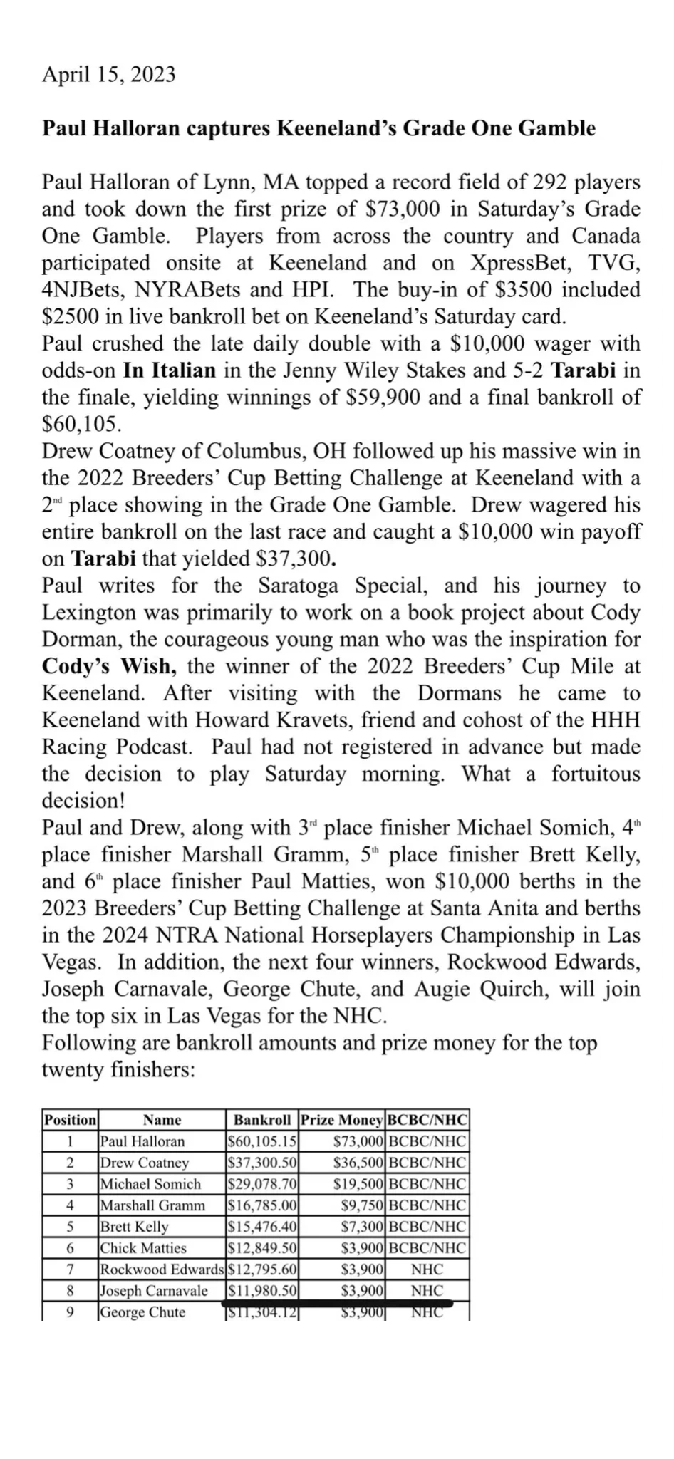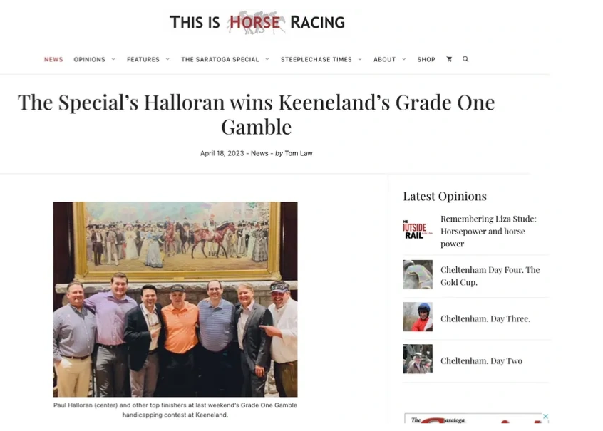 Tom Law, Managing Editor of the This Is Horse Racing Website and the Saratoga Special, wrote a fantastic article detailing HHH Racing Podcast Co-Host Paul Halloran's magical weekend at Keeneland including his victory in the Grade One Gamble and his meeting Cody Dorman and his family.